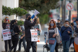 11/27/20 - LCA's 34th Annual Fur-Free Friday demonstration was attended by an amazing group of dedicated activists, including actress Nicky Whelan. LCA Founder Chris DeRose also made a special appearance. Demonstrators educated the public about the link COVID-19 and mink fur farms, and stopped outside retailers still selling fur (Saks Fifth Avenue, Neiman Marcus, and Dolce & Gabbana), urging these companies to going fur-free immediately before the California fur ban is enacted in 2023.