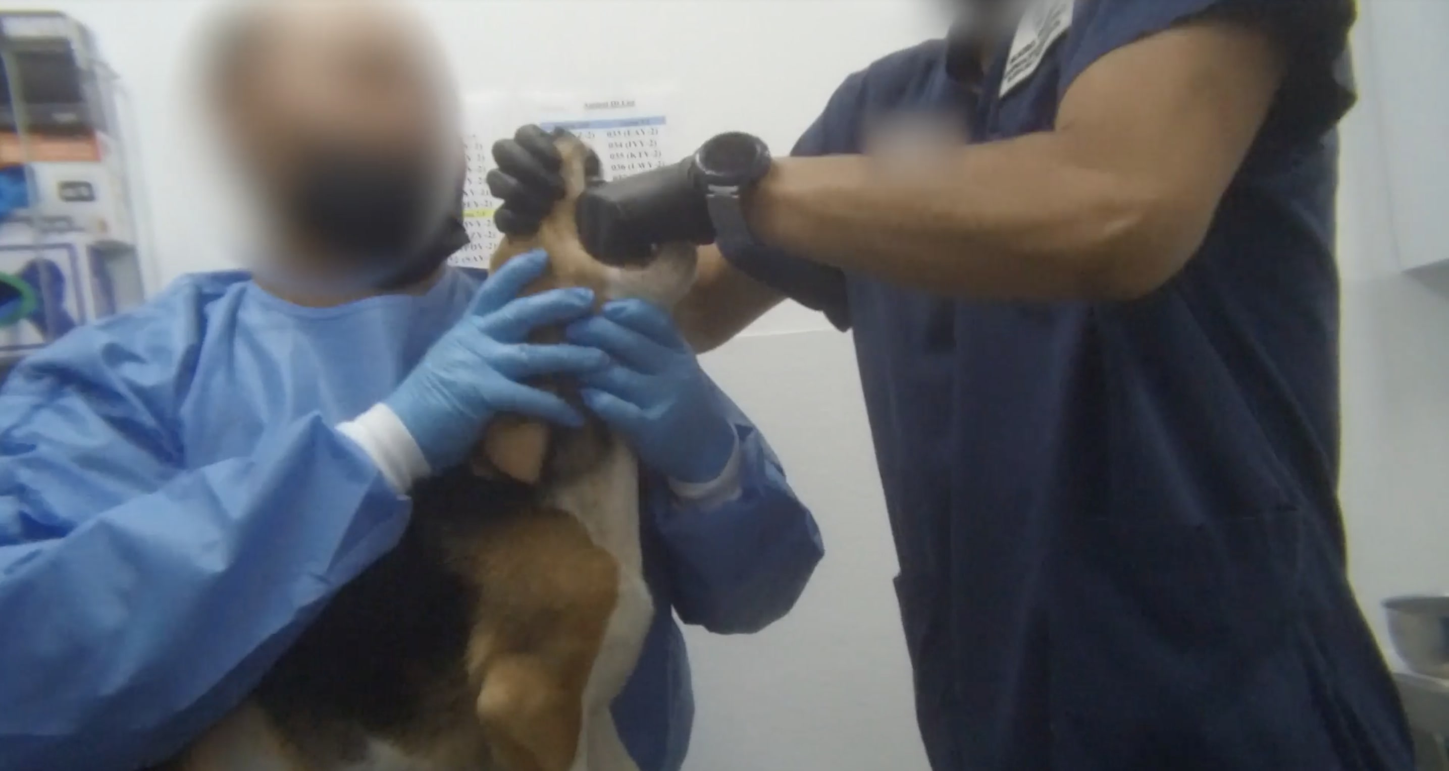 - Use of invasive procedures, including jugular blood draws, catheterizations, and EKGs, where dogs struggled so much that their legs were bound together.